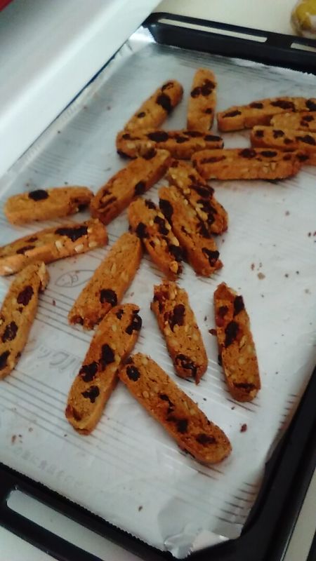 熱々で切ると崩れやすいです。面倒ですが、冷めてから切るのが崩れない秘訣です。クランベリーは甘さ控えめに、レーズンだと甘く仕上がります。ナッツは、ヒマワリの種が崩れにくくてオススメ!アーモンドは崩れやすいので慎重に。