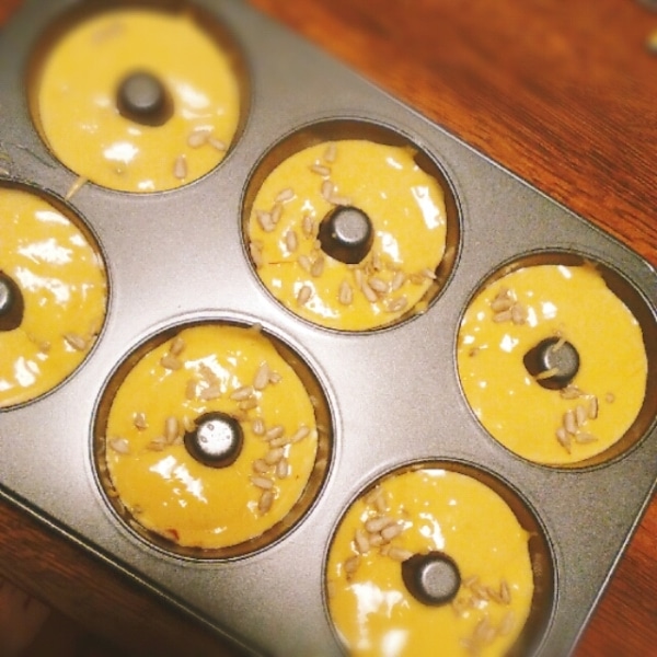 ヒマワリの種入りの焼ドーナッツ。生クリームのおかげでしっとりした食感です。