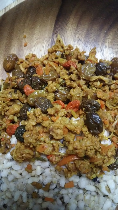 大豆と野菜の淡白な食材に、レーズンの甘みが味をひきたたせたドライカレーです。