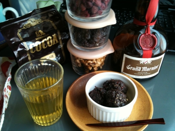 ドライラズベリーとレーズンにグランマニエをふりかけておき少し柔らかくする。