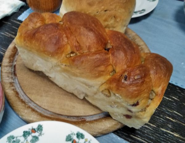 焼き上がったら熱いうちに表面にマーガリン(又はバター)を塗る。編み目にくるみやクランベリーを埋め込むようにして入れて飾る。