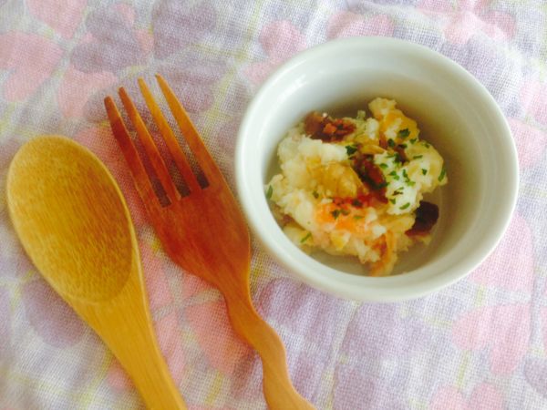 茹で上がったジャガイモと人参をマシャーで潰し塩コショウとマヨネーズで味を整えます
