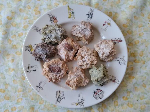 オーブンシートに、スプーンで小さなお団子サイズで落とし、軽く押さえて平たくし、170度のオーブンで20〜30分焼きます