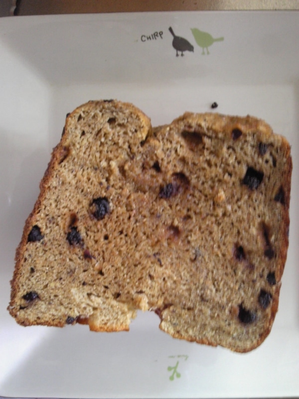 ブルーベリーの代わりに砕いたクルミを入れてもおいしいです。その際も最初に他の材料と一緒に投入してください。ミックスコールで入れてもきれいに混ざりません。ホームベーカリーはパナソニックのものを使用しています。