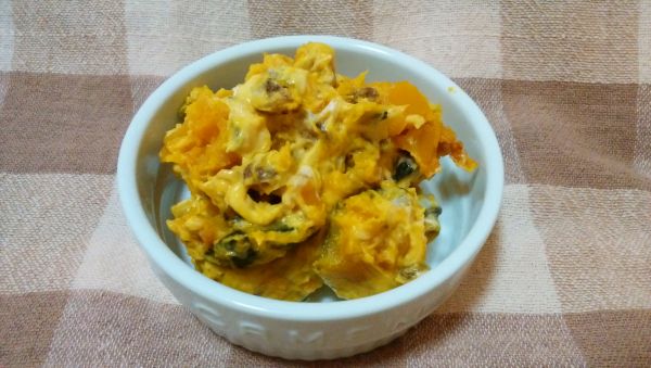 かぼちゃを好みの大きさに崩し、1・3と混ぜます。