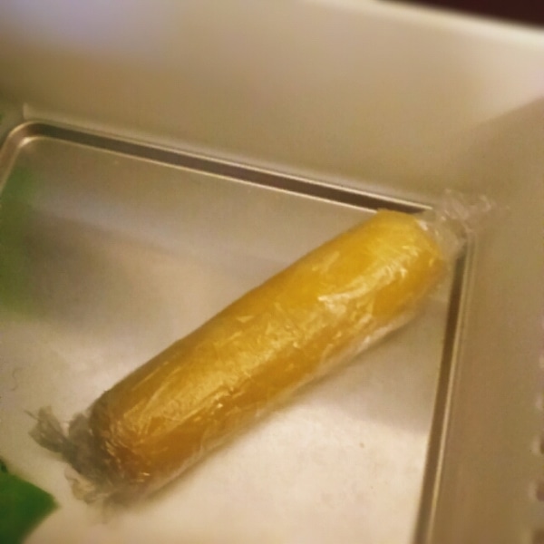 この時点ではまとまっていないので、ラップの上に生地を置いて手で握るようにして棒状に成形してください。捏ねないのがポイント!