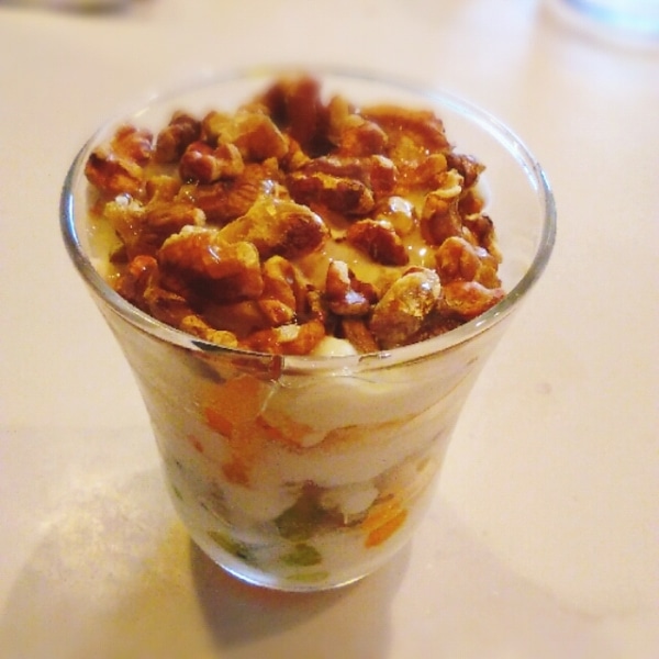 しっとりしたクルミが好きな方は、ヨーグルトと冷凍フルーツの間にクルミを入れても美味しいですよ。私はサクサクの食感が好きなので、最後に乗せています。