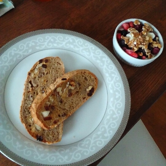 冷蔵発酵で作るドライフルーツとクルミのライ麦パンです。ポメロピールのお砂糖を活かしてシンプルな味付けでいただきます^^