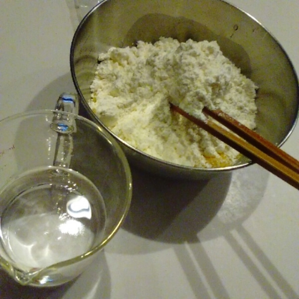ラップを4枚用意して、2枚ずつ重ねます。2枚重ねたうえにクルミを置いて、さらにラップで蓋をします。上から、綿棒でグリグリとつぶしていきます。大きな粒をなくしてください。ローストタイプは口当たりが悪いので、必ず生タイプで!※写真がなくてすいません。