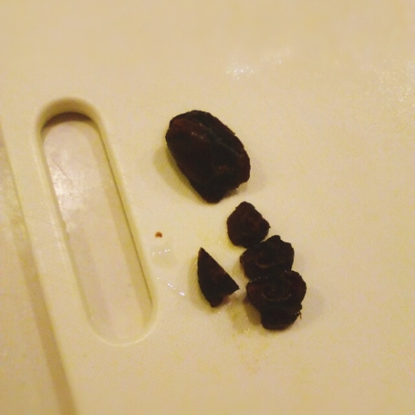 デーツは細かく刻むこと。大きすぎると、切り分けるのが大変ですし、食べるときにも存在感がありすぎます。