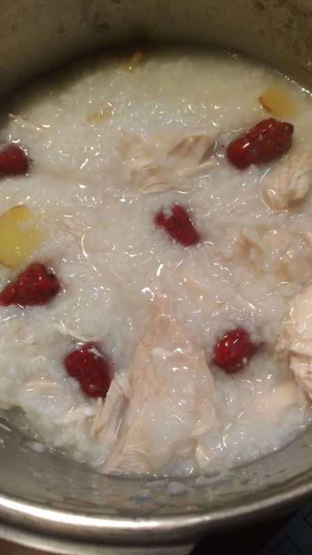 圧力鍋に米、水、ガラスープのもと、塩小さじ1、酒を入れてまぜ、3、1、なつめを入れ強火にかける。