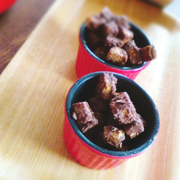 チョコレートを耐熱容器に入れて、ラップをして500wで1分半ほど加熱。ラップをしないと、チョコがうまくとけません!