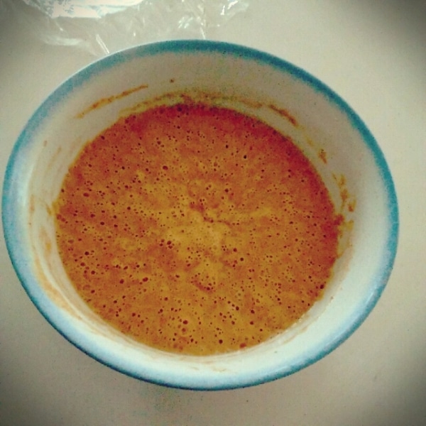 卵を溶いて、人肌に温めておいた牛乳を合わせます。①のボウルに一気に入れて、泡だて器で滑らかになるまで混ぜてください。