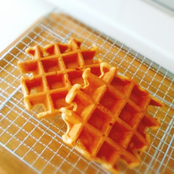 発酵後の生地はプクプク膨らんでいます。ふくらみが悪ければ室温でしばらく放置。軽く混ぜて、油を塗ったワッフルメーカーで焼いていきいます。(油は最初のみでOK)焼き時間はワッフルメーカーの説明書通りで^^