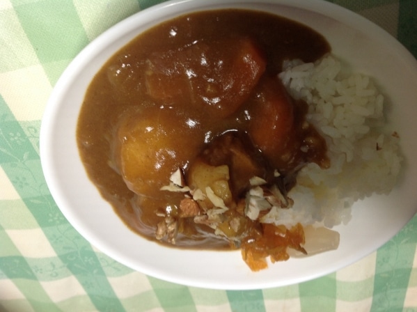 カレーライスにアーモンドとクルミをトースターで軽く火を通して刻んだらトッピングして出来上がり!