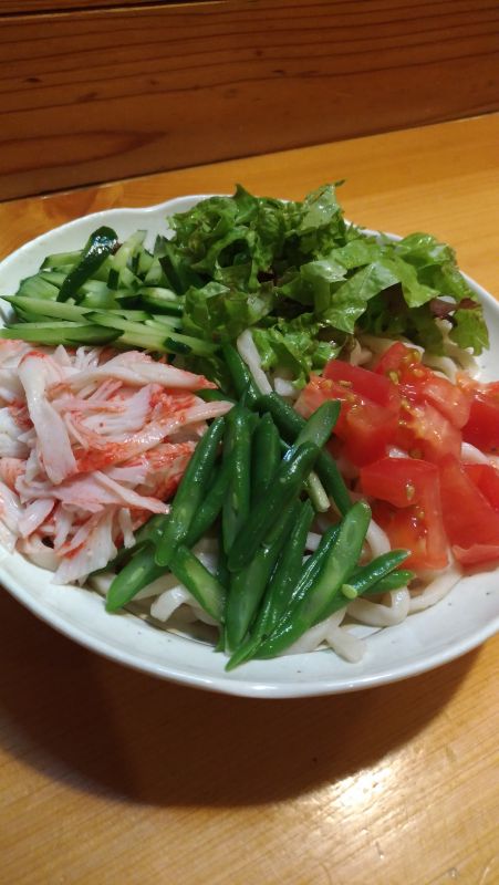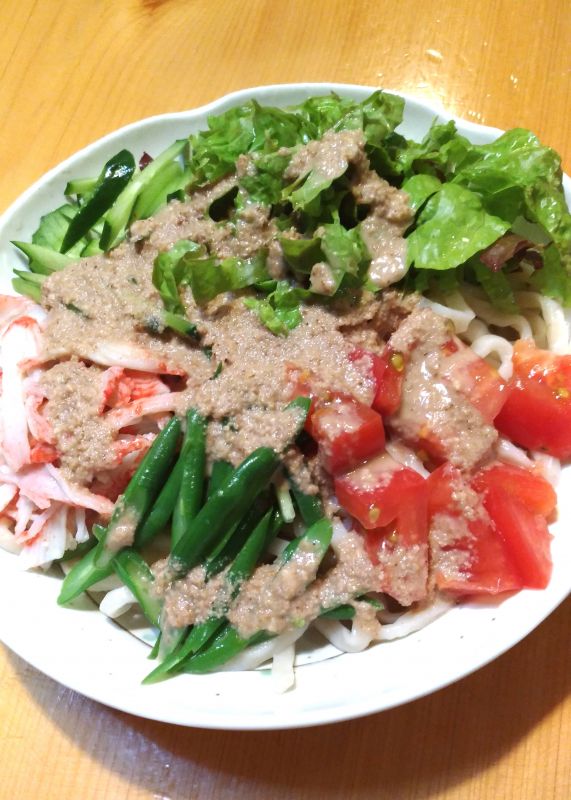 胡桃のコクが濃厚で美味しいごまだれで食べるサラダうどんレシピです。