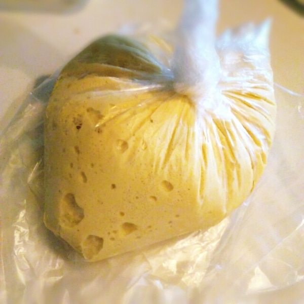 ポリ袋に生地を入れて軽く口を縛ります。念のため、もう一十袋に入れてください。もう一枚の袋は縛らなくても大丈夫です。