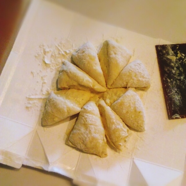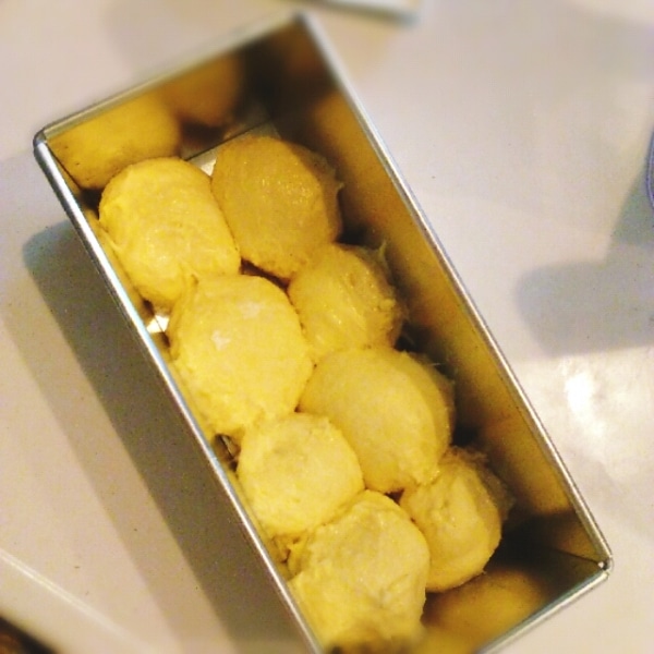 国産の粉を使う場合には、牛乳は少なめにした方が、生地が扱いやすいです。カメリアとかイーグルなら115gで大丈夫ですよ。1つ1つ丸めるのが面倒なら、生地にクルミを混ぜ込んでもOK。表面にクルミが出ると焦げちゃうので、巻き込むようにしてください。
