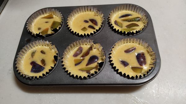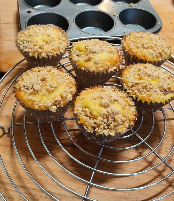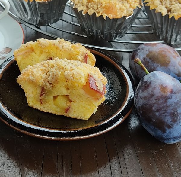 生または素焼きアーモンドがあれば、アーモンドパウダー無しで作れます。バターを使ったしっとり美味しいマフィン生地に、サクサククランブルが美味しいですよ。旬のフルーツでアレンジもできます。