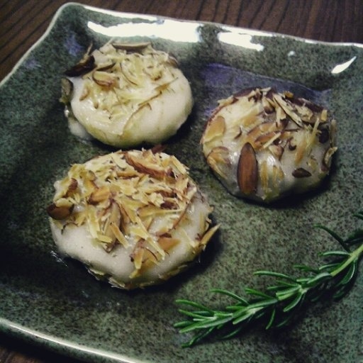 小豆餡を2で包み、スライスしたアーモンドをまぶして蒸し器で15分ほど蒸す。