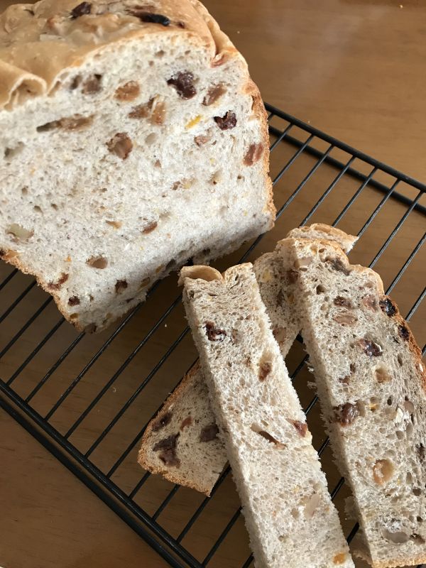おうちで焼くパンならではのどっしり感と、一口ごとに口の中いっぱいに広がるドライフルーツの甘み、くるみの歯ごたえがたまりません!
