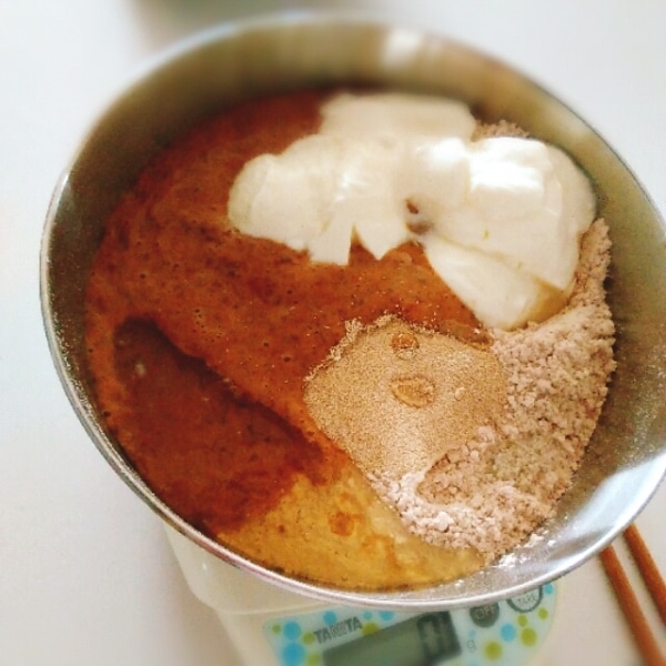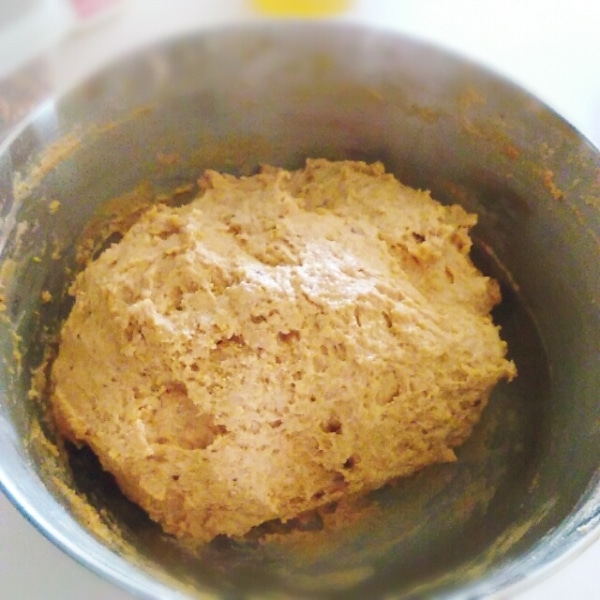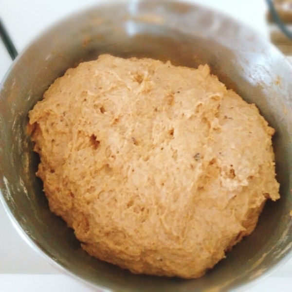ヨーグルトの量は、粉の種類によって加減してください。今回は全量、全粒粉を使ったので250g近いヨーグルトを使用しました。ベタベタしているけどまとまる、という程度にします。ゴムベラを使って練るようにすると簡単。ボウルに入れてラップをしてタオルをかけて一次発酵。
