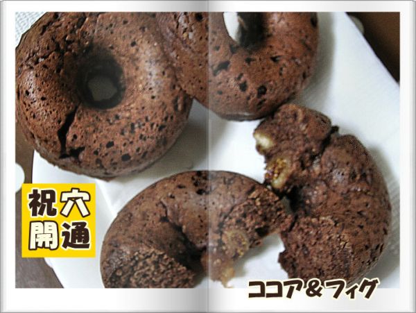 ココアといちじくは相性いいんですよ★ひと口ほおばると豆腐がモチモチ、いちじくがプチプチ。モチモチ・プチプチ~の食感が楽しい。バターも卵も乳製品も使っていないヘルシードーナツです。