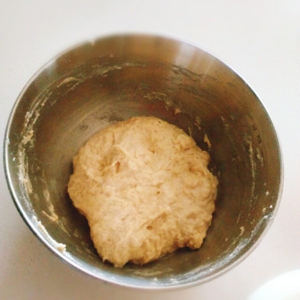 ドライイーストめがけて、ぬるま湯を投入。ゴムベラで粉っぽさがなくなるまで混ぜてください。捏ねません。