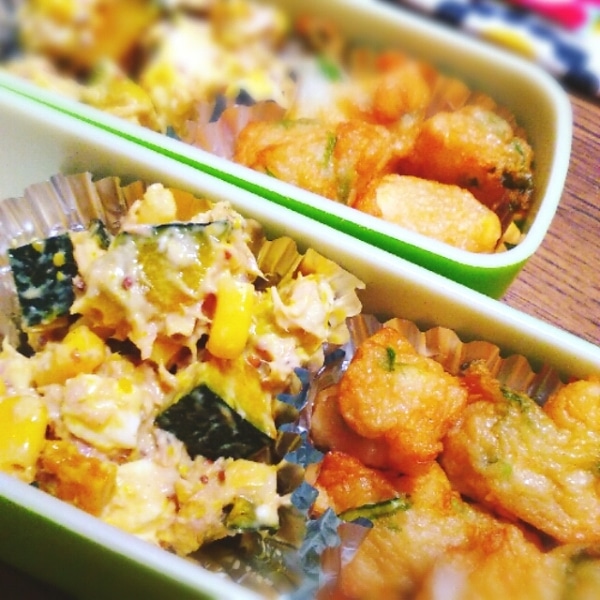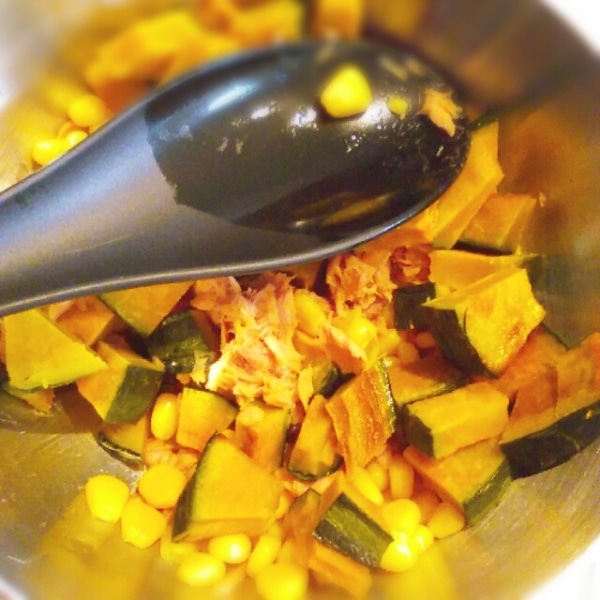 常備しているローストかぼちゃに、ツナ缶、コーンを加えた簡単サラダ。家にある物で出来るので、週末のなにもない時におすすめ^^