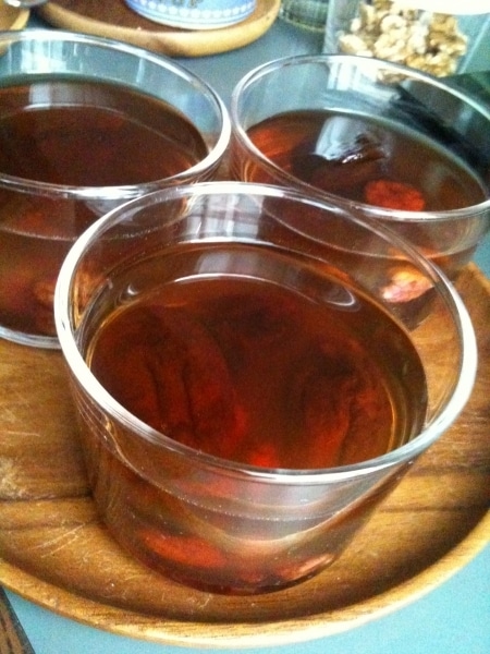 グラスを3個用意して、一個あたりにプルーン3粒ずつ入れておく。(お好みでドライラズベリーなども)