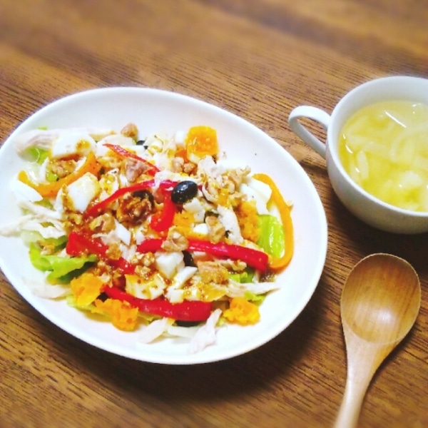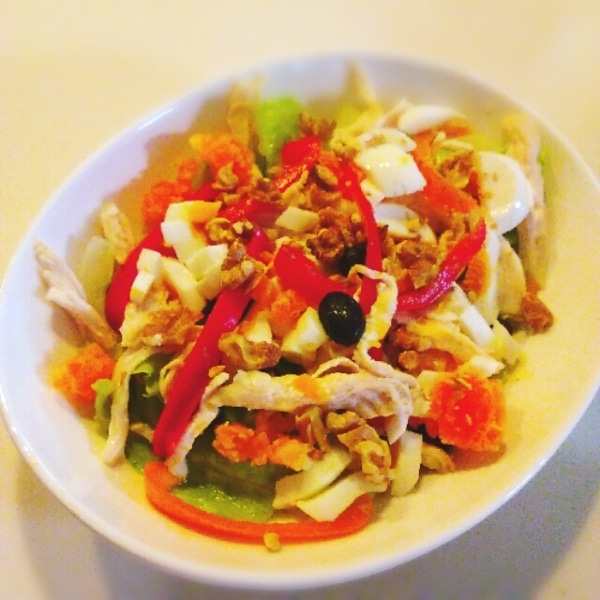 ドレッシングに混ぜたしっとりクルミと、最後にトッピングする大粒クルミの美味しいサラダです^^