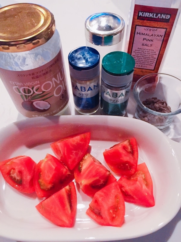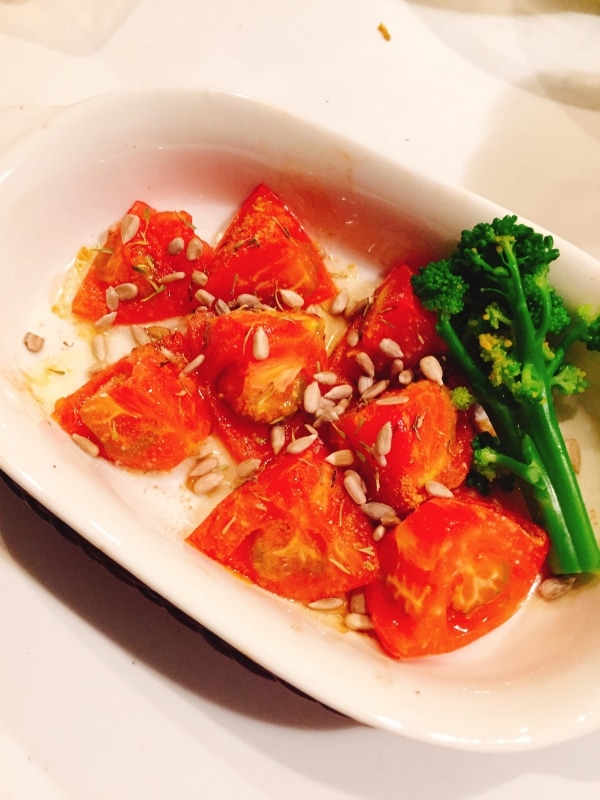 ココナッツやスパイスの香りとひまわりの種の歯ごたえがアクセントになり、とっても美味しいです☺︎ミニトマトでも、バジルやローズマリーなど他のスパイスでも!ぜひお試しください☆