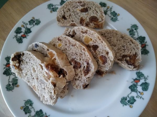 ドライフルーツとナッツがぎっしりで、全粒粉入り、とっても健康的なパンです。小腹が空いた時にも良いですよ。