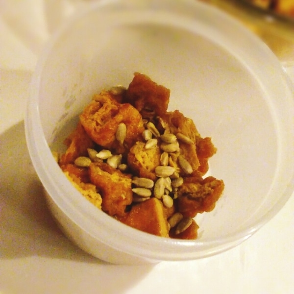 稲荷ずしはお弁当に入れると食べにくいという夫。稲荷の皮を小さく刻んでみたら、お弁当でも食べやすくなりました^^ヒマワリの種入りで子供たちもお気に入り。