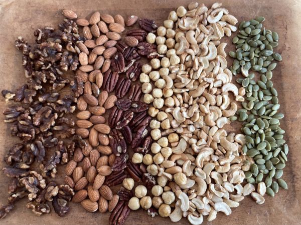 今回はアーモンド、クルミ、カシューナッツ、ヘーゼルナッツ、ピーカンナッツ、カボチャのタネを使いましたが、お好みのナッツでどうぞ。