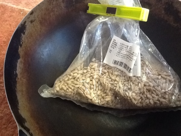 カシューナッツとひまわりの種に塩を振り、弱火で炒めます。
