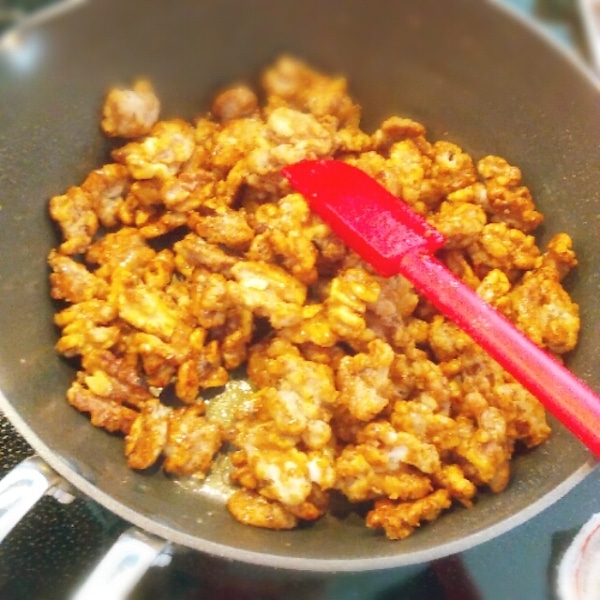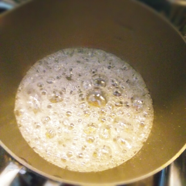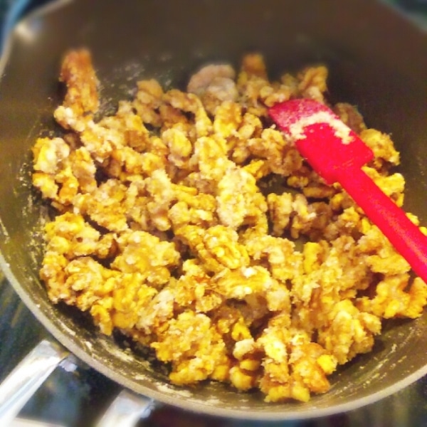 ロースト後のクルミよりちょっと色が濃いくらいになればOK。蜂蜜とバターを全体にからませて、火を止めます。