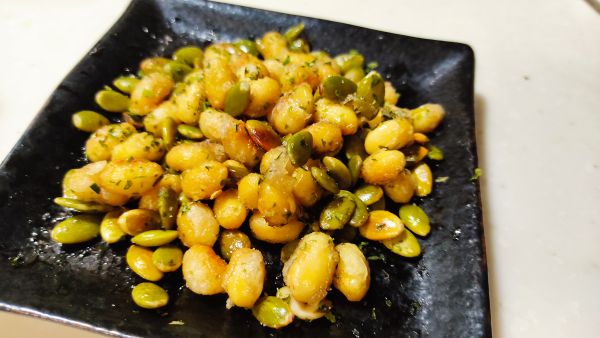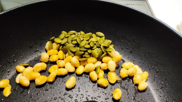 レシピトップ › かぼちゃの種(生・中国産)のレシピ › レシピ かぼちゃの種(生・中国産)の商品ページへ レシピ投稿 パンプキンシードと大豆のカリカリのり塩 share × このレシピを共有 LINE X Facebook URLをコピー いいね!1 おつまみに最適です! posted by ラン子ラン子さんの他のレシピ 材料 (1) 大豆水煮大さじ3 片栗粉小さじ1/2 かぼちゃの種大さじ3 サラダ油大さじ2/3 塩ふたつまみ 青のり小さじ1/4 作り方 1 大豆水煮に片栗粉をまぶします。 2 フライパンにサラダ油を熱し1を入れます。 3 大豆の表面がカリッと焼けてきたら木べらで混ぜながら炒めます。 4 全体がややきつね色になってきたらかぼちゃの種を加えて、さらに炒めます。 5 皿に取り出し、青のりと塩をふって和えたらできあがり。 一言コメント とても簡単です。 関連する商品 かぼちゃの種(生・中国産)