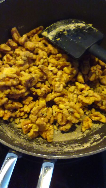 火をつけます。弱火でじっくり結晶化した砂糖を溶かすイメージです。つやが出てきたら火を止めて、バターと蜂蜜を絡めて完成。