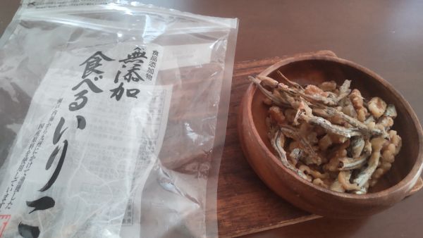 焦げないよう極弱火で20分くらい根気よく念入りにカラカラになるまで乾煎りすることで、いりこの水分が飛び生臭さが解消され出来上がりが湿気らずカリカリのまま保存できる。