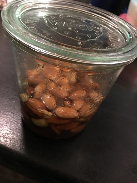 煮沸消毒した瓶にローストしたナッツを入れ