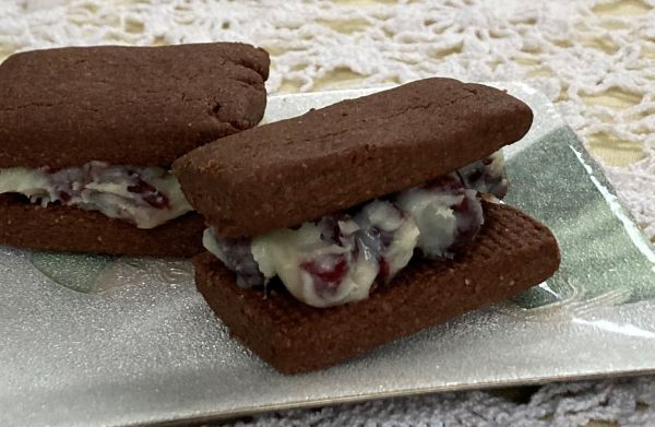 ココアのクッキーにクランベリーのホワイトチョコを挟みました