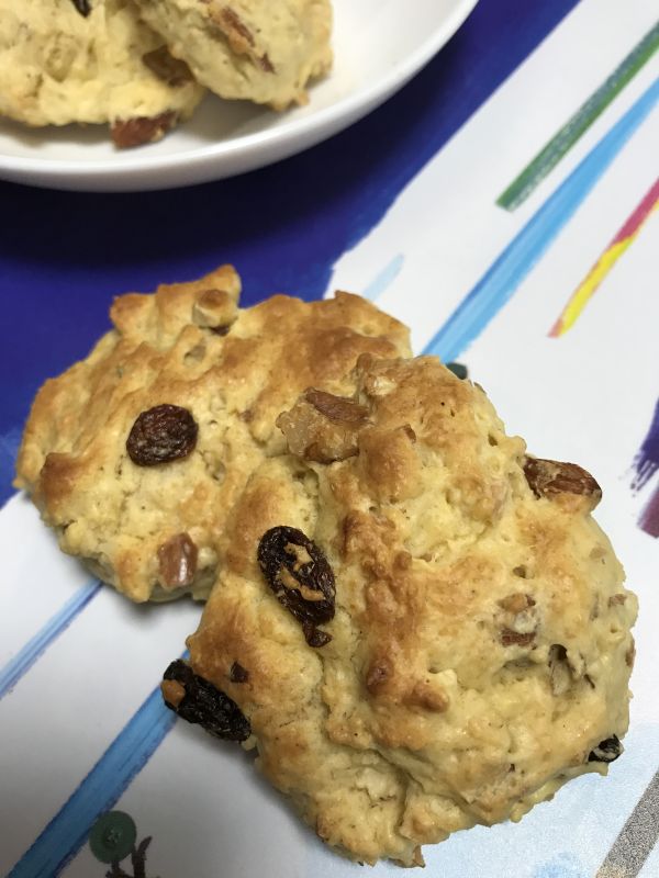 ボウルにホットケーキミックス、オールスパイスを加えて混ぜ、ミックスナッツ、レーズンを加えて軽く捏ねるように混ぜる。