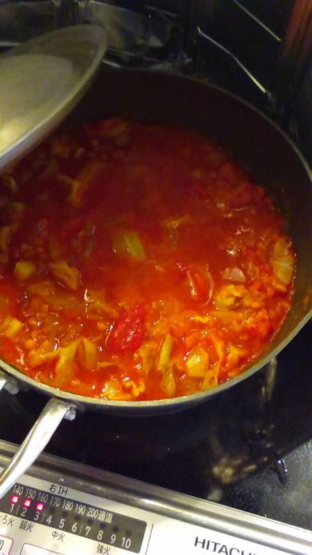 鍋に野菜を入れて炒め、火が通ってきたらレンズ豆とトマト缶を加えます。5分ほどグツグツして、豆が水を吸ってきたらカップ半分の水と刻んだプルーン、コンソメを小匙1入れます。