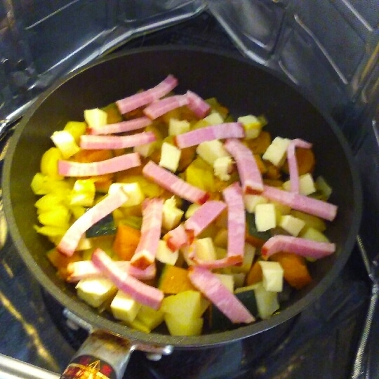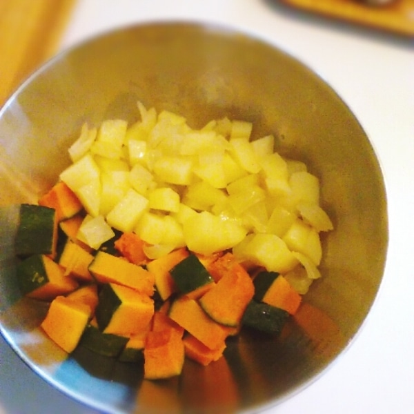 カボチャは小さめのひと口大に切って、耐熱容器に入れてラップをして3~4分加熱。じゃがいも、玉ねぎも同じような大きさに切ってから別の耐熱容器に入れて、ラップをして3分加熱します。ベーコンはスティックもしくは角切りで。