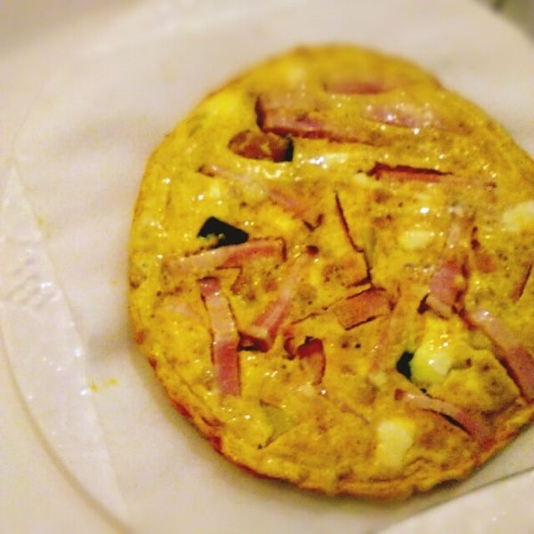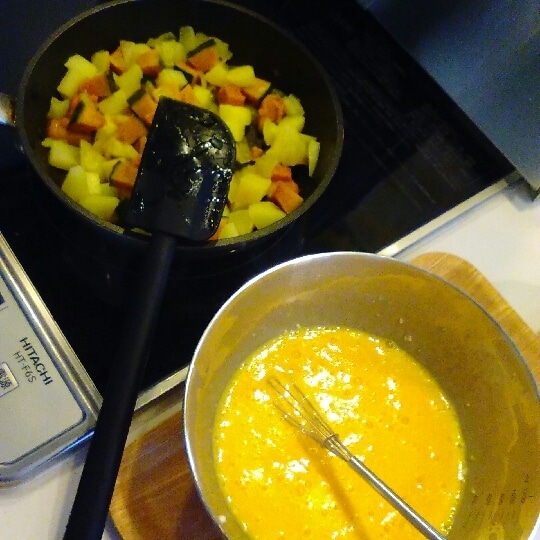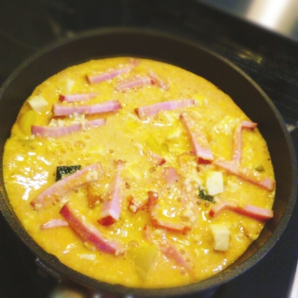 フライパンに多めにオリーブオイルを熱したら、①の野菜を軽く炒めます。油が全体に回ったら、チーズをちぎりながら乗せ、さらにベーコンも飾ります。レーズンは1粒を4等分して、上から散らしてください。②の卵液を静かに注いでください。