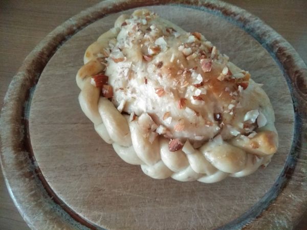 カスタードクリームとレーズン、煮りんごが入っています。縁にみつあみを施し、表面にはアーモンドとグラニュー糖をまぶした、カルツォーネ形の菓子パンです