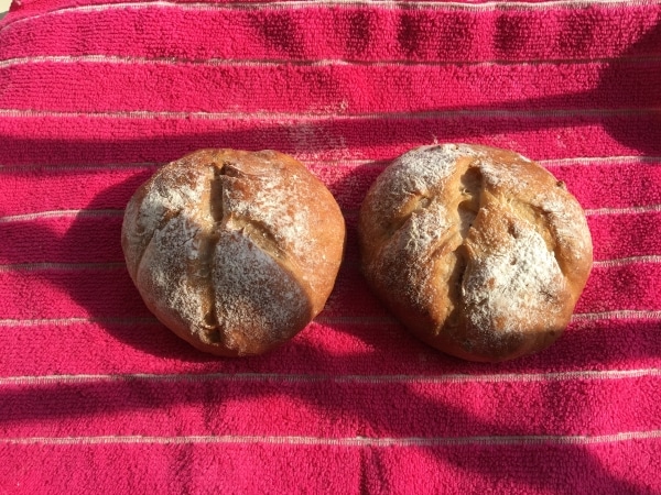 いちじくとクルミを細かくして生地に練りこみ丸く成型して190°で20分焼きました。