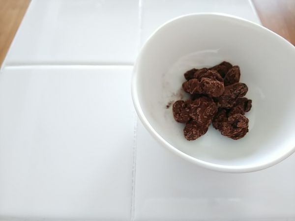 ちょっぴり体にいいおやつ。レーズンにチョコをコーティングした、鉄分補給用おやつを常備しています。