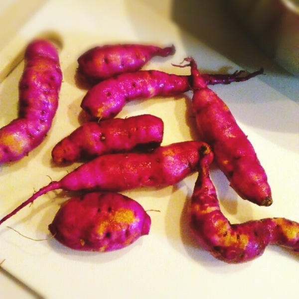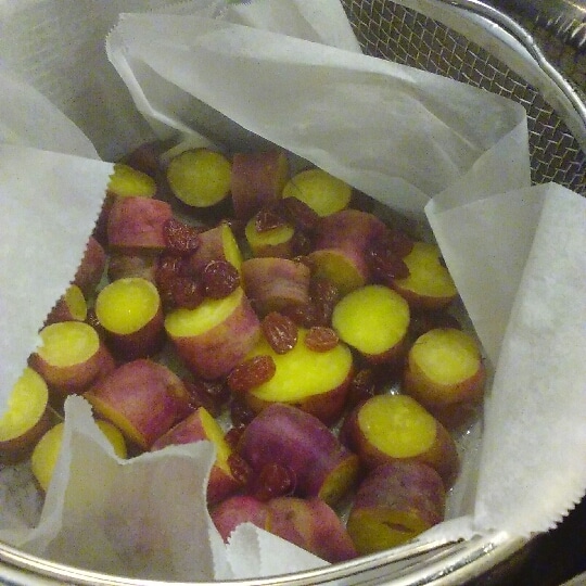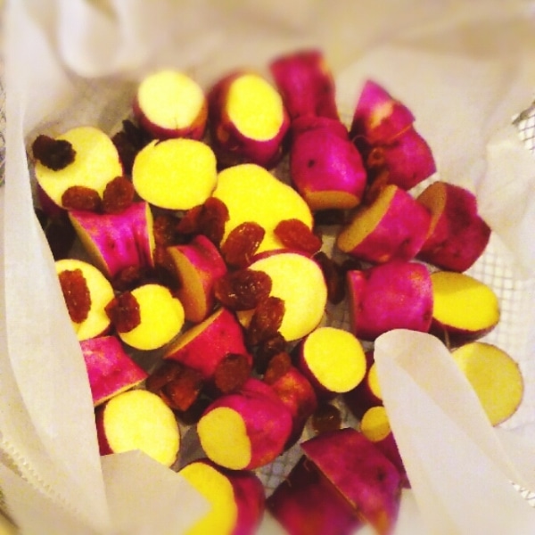 子供が掘ってきたとれたてのミニさつまいも。レーズンの甘みだけでほっこり美味しく蒸しました^^